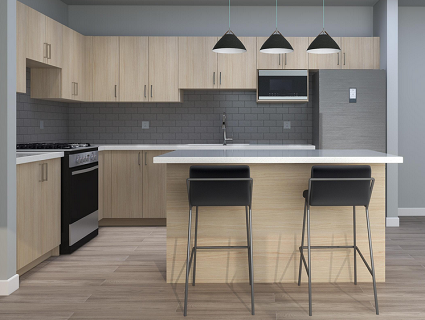 Ein modernes Apartment-Wirtschaftsküchenschrank ist eine zeitgemäße und budgetfreundliche Option für Küchen in Wohnungen oder kleineren Wohnräumen. Es ist im Hinblick auf Funktionalität, Praktikabilität und Erschwinglichkeit konzipiert. Diese Schränke verfügen häufig über schlanke, klare Linien und minimalistische Designs.